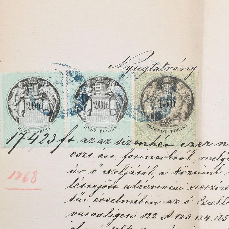 Ritka, sárga papírú 15Ft és 2 db fehér papírú 20Ft okmánybélyegekkel.