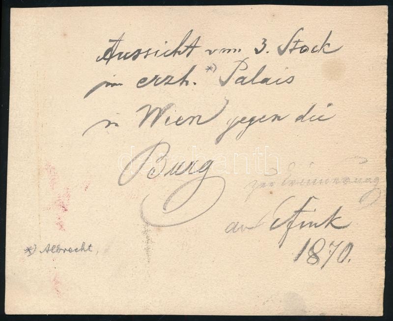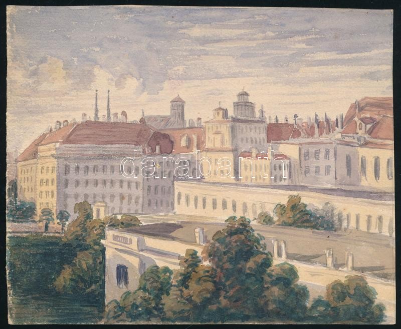 1870 Bécs, kilátás az Albrecht főherceg palota 3. emeletéről a várra, hátoldalon feliratozott akvarell kép, 14,5×17,5 cm
