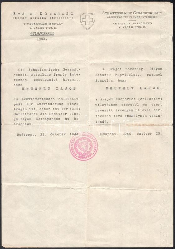 1944 Svájci Követség igazolványa (Schutzpass) magyar zsidó személy rés... https://www.darabanth.com/en/38-Major-auction/38.1/Art-paper-and-other-collectibles/Judaica~15586/1944-Svajci-Kovetseg-igazolvanya-Schutzpass-magyar-zsido-szemely-reszere-aki-svajci-csop~II2611859