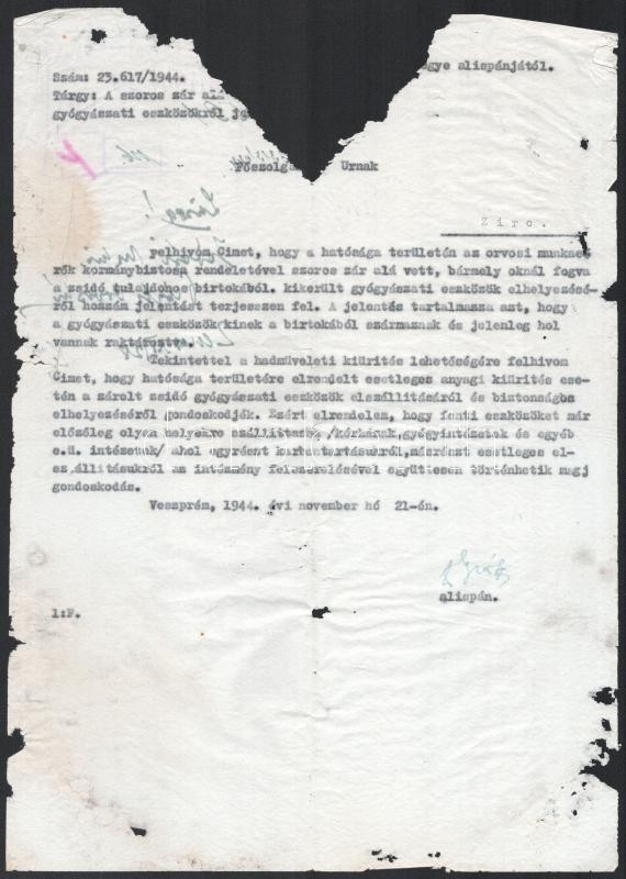 1944. november, Alispáni leirat zsidóktól zár alá vett gyógyászati eszközökről, sérült!