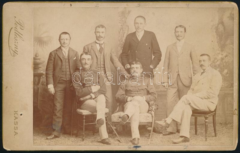 1893 Kassa, Fráter Loránd és Jenő, Szemere Kálmán és Béla, Berzeviczy Béla, Hammersberg Árpád, csoportkép, keményhátú fotó Podleszny műterméből, 10,5×16,5 cm