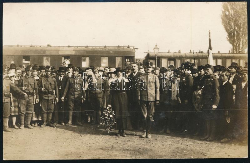 Description: 1921 Habsburg-Lotaringiai IV. Károly (1887-1922) magyar király feleségével, Zita királynéval visszatérési kísérletekor a biatorbágyi pályaudvaron, eredeti fotó, 8,5×13 cm / Charles I of Austria with his wife Zita of Bourbon-Parma photo