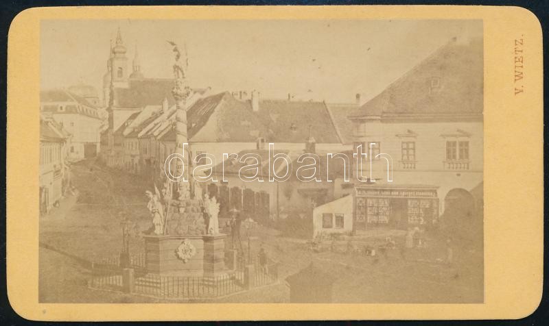 Description: cca 1870 Nagyszombat (Felvidék / Trnava) főtere a Szentháromság-szoborral és üzletekkel, keményhátú fotó V. Wietz műterméből, szép állapotban, 6×10 cm / vintage photo, good condition
