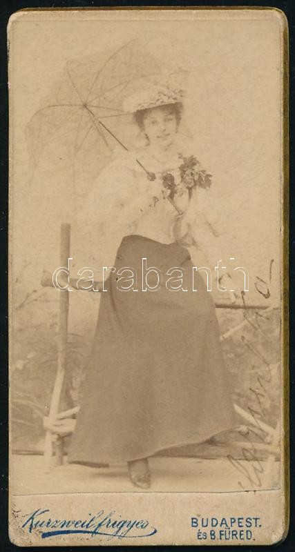 cca 1890-1900 Fiatal hölgy napernyővel, keményhátú fotó Kurzweil Frigyes műterméből, kisméretű vizitkártya, 7,5x4 cm