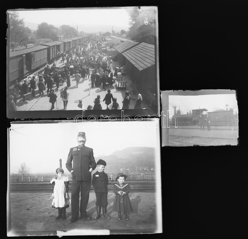 Description: cca 1924 Vasútállomás peronja, vasutas a családjával, kisebb gőzmozdony, 3 db vintage NEGATÍV üveglemezen Kerny István (1879-1963) budapesti fotóművész hagyatékából, 9x12 cm és 4,5x6 cm között