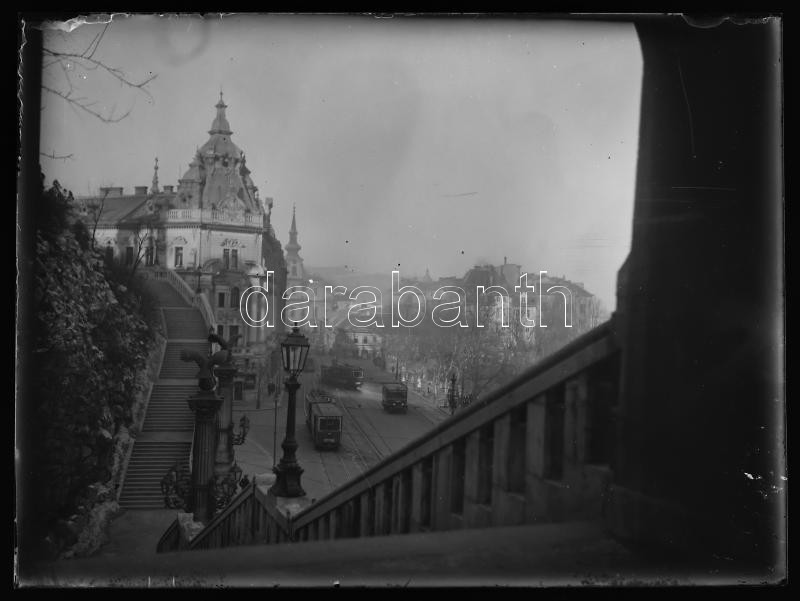 Description: cca 1928 Budapesti villamosok (31-es és 14-es járat), továbbá autóbusz a Gellérthegy mellett, 1 db vintage NEGATÍV üveglemezen Kerny István (1879-1963) budapesti fotóművész hagyatékából, 9x12 cm