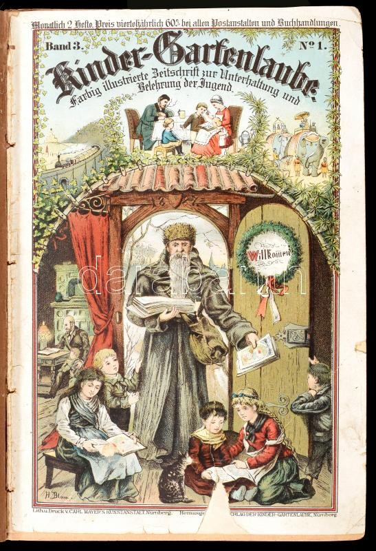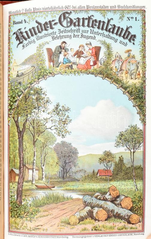 1887 Kinder-gartenlaube. Farbig illustrierte Zeitschrift zur Unterhaltung und Belehrung der Jugend. Band 3. N. 1-12., Band 4. N. 1-12. Nürnberg, Carl Mayer's Kunstanstalt. Benne rengeteg színes litografált táblával. Német nyelven. Korabeli félvászon-kötés, kopott borítóval, sérült gerinccel, benne kijáró lapokkal is, néhány lapszélen, táblán sérülésekkel, szakadásokkal, egy lapon javításnyomokkal, az első résznél (Band 3), a 48-51. oldalak között (49/50, N. 4 címlap?) a lapok hiányoznak, a második részben (Band 4) a 9-10. számokat felcserélték a kötésnél.