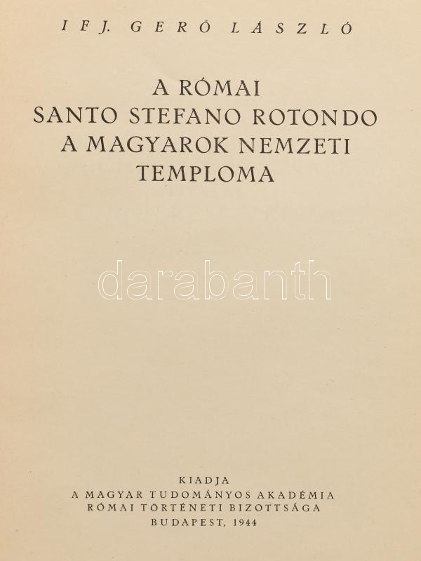 Ifj. Gerő László: A római Santo Stefano Rotondo, a magyarok nemzeti temploma. Bp., 1944., Magyar Tudományos Akadémia Római Történeti Bizottsága,(Kir. M. Egyetemi Nyomda-ny.), 120 p.+2 (színes képtáblák) t. Az oldalszámozáson belül, 71-112 oldalak között, fekete-fehér képekkel illusztrált. Első kiadás! Ifj. Gerő László műszaki doktori értekezése. Kiadói papírkötés, a hátsó borítón, alul, kis hiánnyal, a gerincen kis szakadásokkal, a borítószéleken kis gyűrődésekkel.