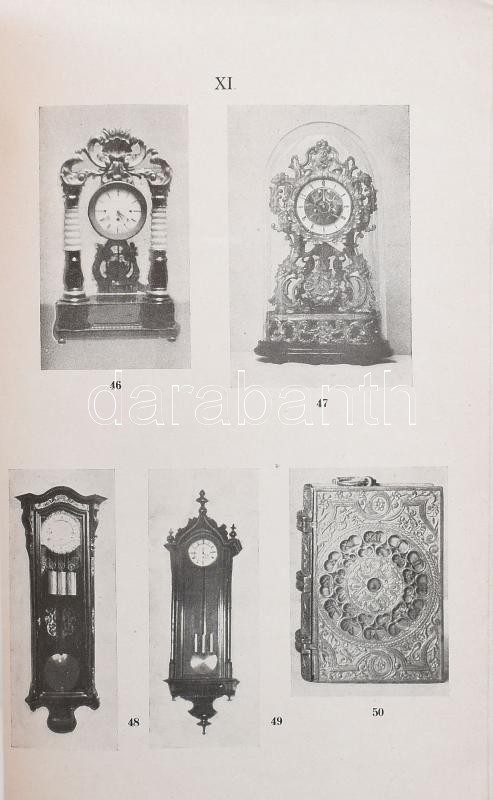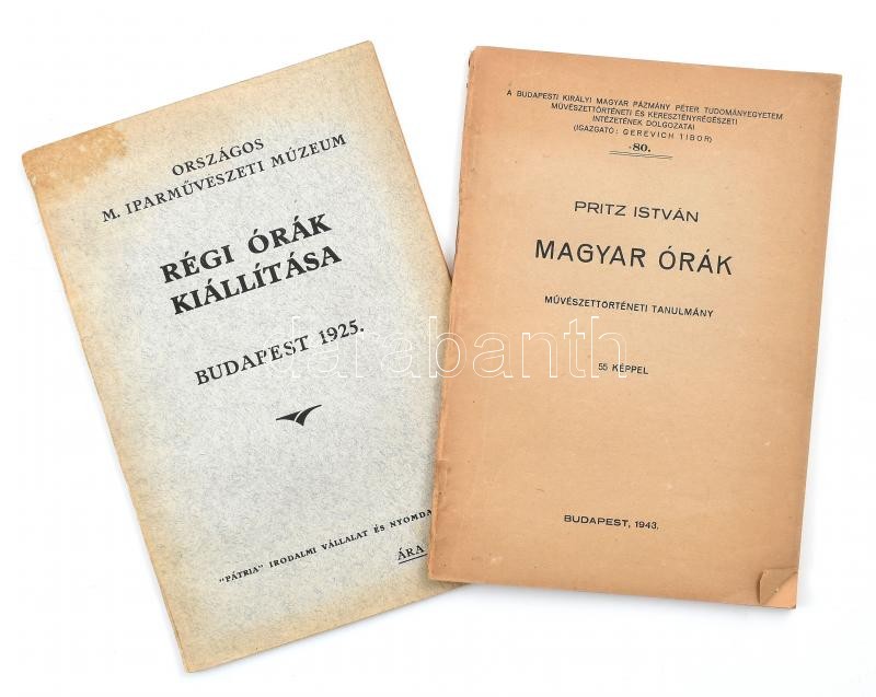 Vegyes órákkal kapcsolatos tétel, 2 db: Pritz István: Magyar órák. Művészettörténeti tanulmány. 55 képpel. A Budapesti Királyi Magyar Pázmány Péter Tudományegyetem Művészettörténeti és Keresztényrégészeti Intézetének Dolgozatai 80. Bp., 1943., Grega Nándor-ny., 62 p.+XII (fekete-fehér képtáblák) t. Kiadói papírkötés, a gerincen kis sérüléssel.; 1925 Régi órák kiállítása. Az órák történetével és 53 képpel. Szerk.: Csányi Károly. Országos M. Iparművészeti Múzeum. Bp., 1925.,"Pátria", 59 p.+XII (fekete-fehér képtáblák) t. Kiadói papírkötés, a borító felső részén folttal, a gerincen egészen kis szakadással.;