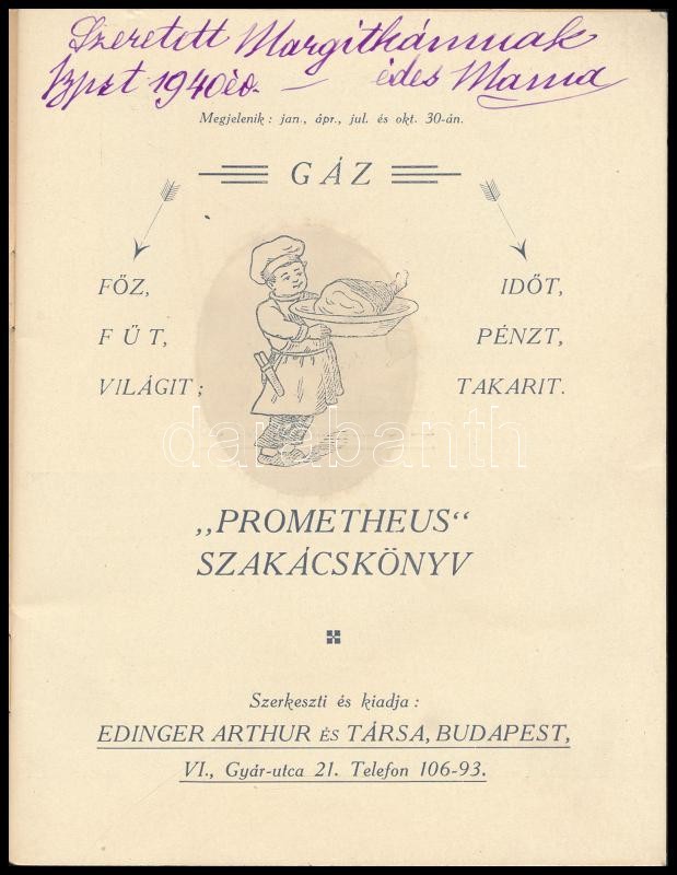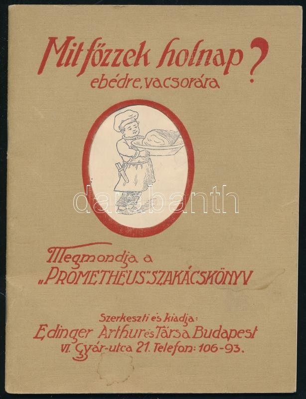 Description: Mit főzzek holnap, ebédre, vacsorára? Megmondja a "Prometheus" szakácskönyv. Szerk. és kiadja: - -. Bp.,én., Edinger Arthur és Tsa, 32 p. Szövegközti és egészoldalas illusztrációkkal. Kiadói papírkötés, kissé foltos borítóval, 1940-es ajándékozási sorokkal a címlapon.
