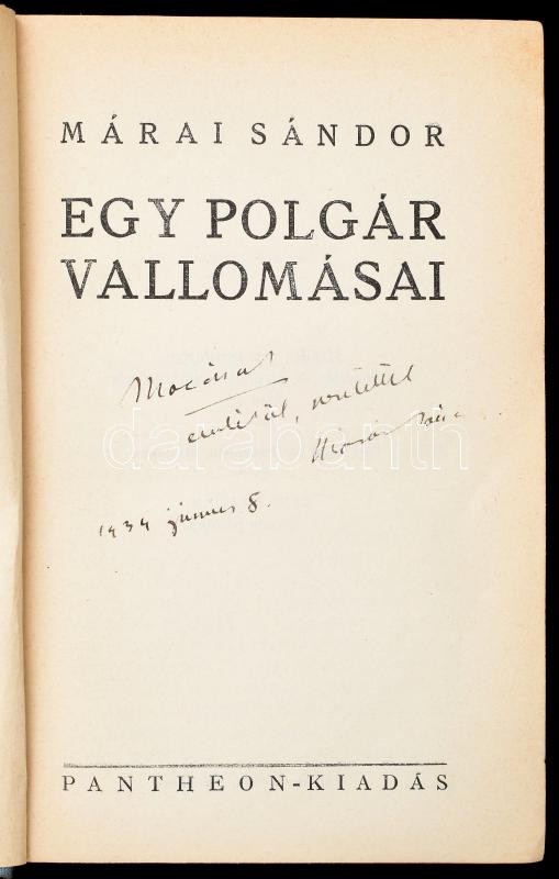 Márai Sándor: Egy polgár vallomásai. Bp.,[1934], Pantheon,(Tolnai-ny.) 315+4 p. Első, cenzúrázatlan kiadás. Kiadói aranyozott egészvászon-kötés, kissé kopott borítóval és kopott gerinccel, egy-két lapon egészen apró folttal. A szerző, Márai Sándor (1900-1989) író, költő, újságíró által DEDIKÁLT példány.