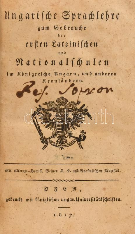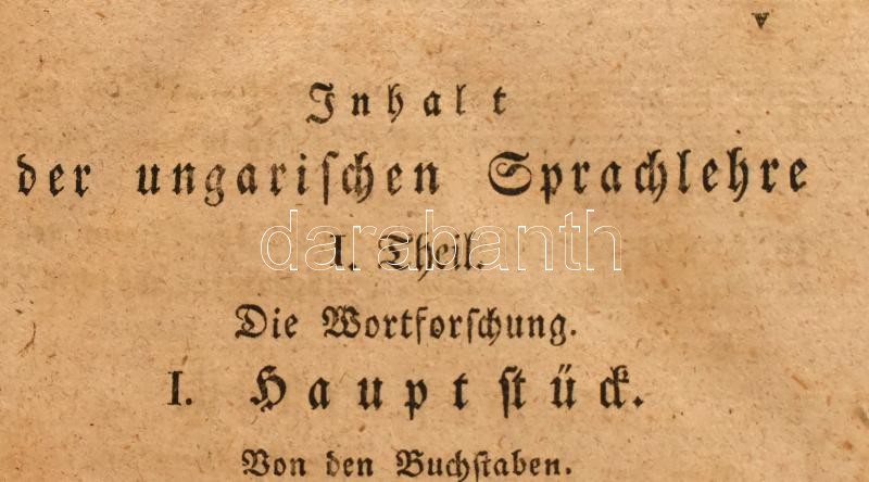 [Verseghy Ferenc (1757-1822)]: Ungarische Sprachlehre zum Gebrauche der ersten Lateinischen und Nationalschulen im Königreiche Ungarn, und anderen Kronländern. Ofen (Buda), 1817., Gedruckt mit Königlichen Ungar. Universitätschriften. XXX+2+527 p. Első kiadás. Német és magyar nyelven. Korabeli félbőr-kötésben, kopott borítóval, a címlapon bejegyzéssel, régi intézményi bélyegzéssel, kissé foltos lapokkal, néhol ceruzás bejelöléssel.