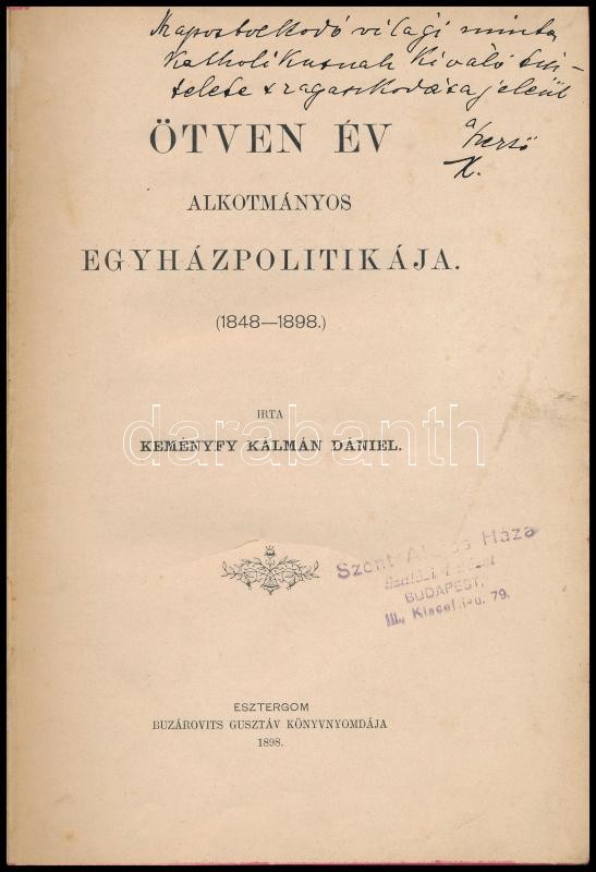 Keményfy Kálmán Dániel: Ötven év alkotmányos egyházpolitikája. (1848-1... https://www.darabanth.com/en/38-Major-auction/38.1/Books/Books-Religion~15608/Kemenyfy-Kalman-Daniel-Otven-ev-alkotmanyos-egyhazpolitikaja-1848-1898-A-szerzo-alta~II2610961