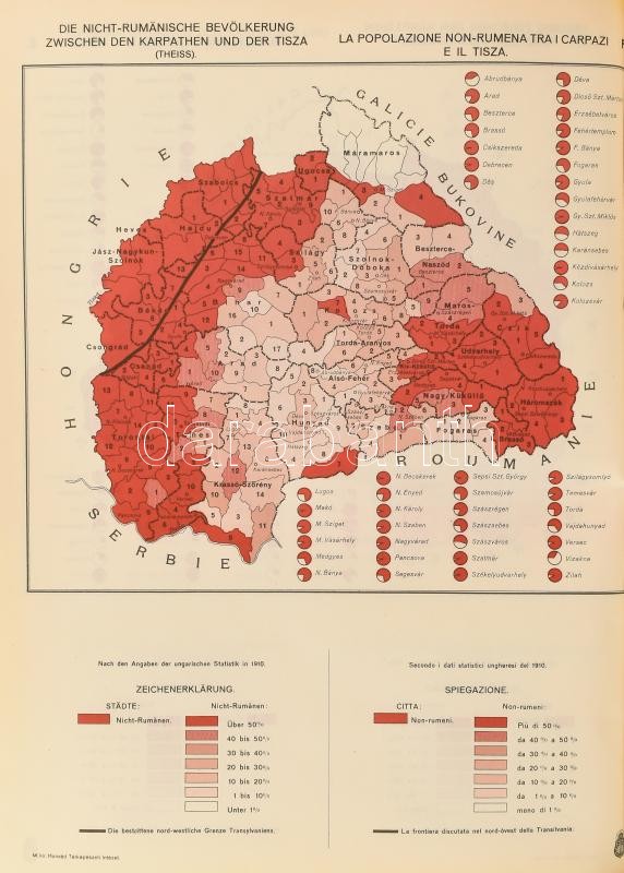 Description: Falsificazioni rumene nelle carte geografiche. Messe in luce dall'istituto di scienze politiche della Societa? Statistica Ungherese. Bp., 1940., Athenaeum, 17 p.+12 t. Gazdag szövegközti fekete-fehér és színes képanyaggal illusztrált. Olasz nyelven. Kiadói papírkötés.