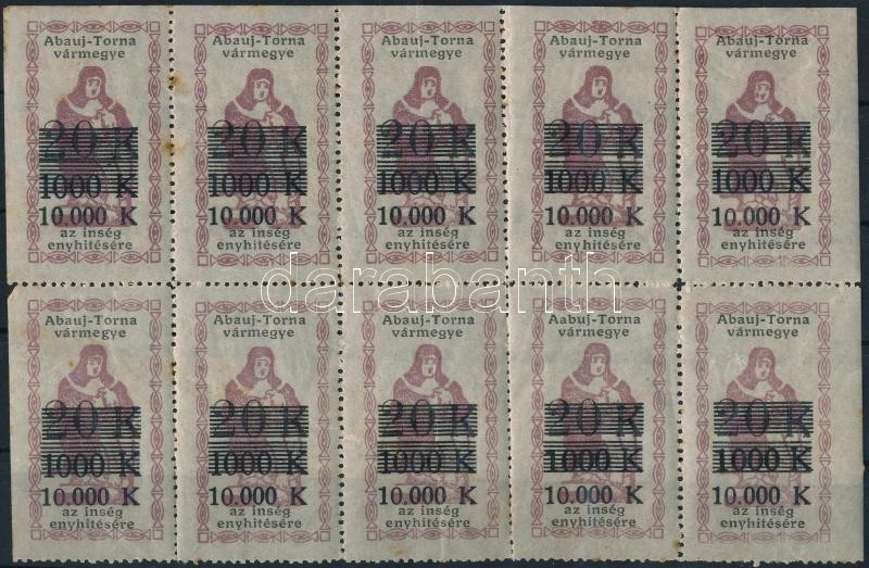 https://www.darabanth.com/en/38-Major-auction/38.1/Foreign-philately-and-postal-history/Document-Stamps~15580/1925-Abauj-Torna-varmegye-10000K1000K20K-insegbelyeg-10-es-tomb-rozsda-block-of-10-chari~II2595222