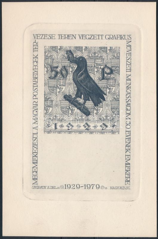 1929-1979 50P okmánybélyeg rézkarc terve Légrády Sándor 50 éves munkássága emlékére készült emléklap kék színben / souvenir card