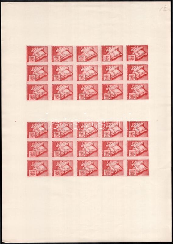 Description: 1959 Légrády Sándor: 75 éves a LEHE piros levélzáró próbanyomat teljes ív 2 x 15 fogazatlan levélzárót tartalmaz / Proof imperforate sheet in red colour