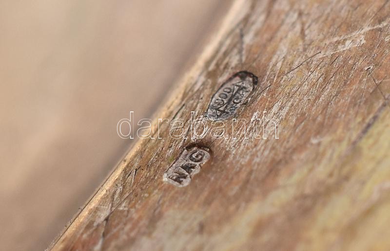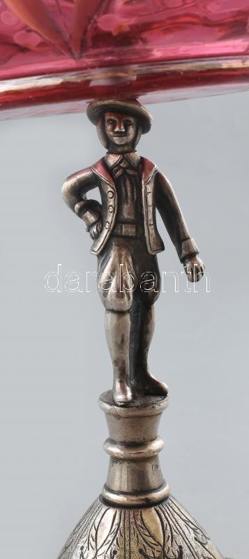 Ezüst (Ag) figurális kínáló, egy ágú gyertyatartóval, rajta formába fújt, zománc festett gyöngyvirág, rózsaszínre színezett, fodros szélű üveg tál (minimálisan ferde), jelzett, hibátlan, nettó: 555g, m:25cm