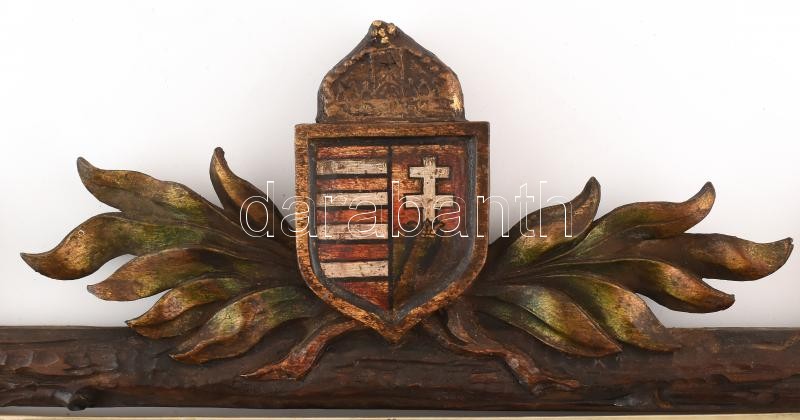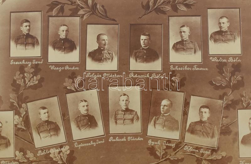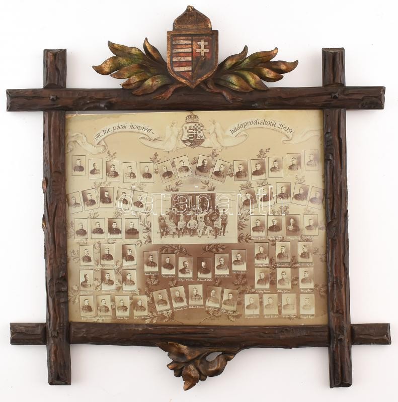 1909 M. Kir. Pécsi Honvéd hadapródiskola tablófotója, angyalos - koronás nemzeti nagycímerrel díszített tablófotó, Fodor József pécsi fényképész műterméből, körbevágott, kopott festett fa keretben, a keret tetején faragott, tölgyfalombos nemzeti kiscímerrel, fotó: 29x34,5 cm, keret: 51x52 cm