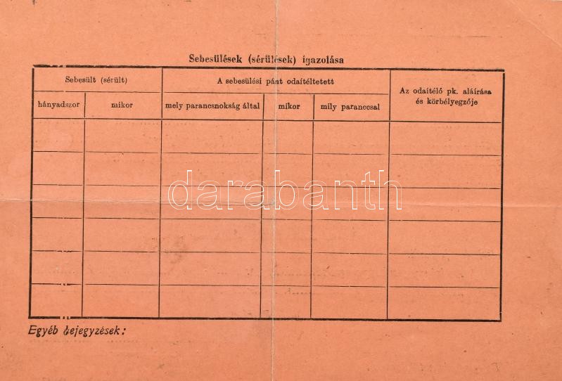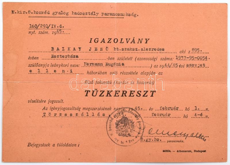 1915-1945 Balkay Jenő, a cs. és kir. 5. vártüzérezred (K. u. k. Festungsartillerieregiment Nr. 5) hadnagya, később a M. kir. honvédség századosa, majd alezredese részére kiállított 5 db oklevél (első ill. második világháborús szolgálatért): A Cs. és Kir. Hadügyminisztérium által kiállított, díszes oklevél hadnagyi kinevezésről, ill. a "Katonai Érdemérem a katonai érdemkereszt szalagján" ezüst és bronz fokozatának adományozó oklevelei, Alexander von Krobatin (1849-1933) hadügyminiszter aláírásával, szárazpecsétekkel; elismerő oklevél Werth Henrik (1881-1952) tábornok, a Honvéd Vezérkar főnökének aláírásával és pecsétjével; valamint I. fokozatú (kardos és koszorús) tűzkereszt viselésére jogosító igazolvány. Hajtásnyomokkal, néhány ázásból eredő folttal.