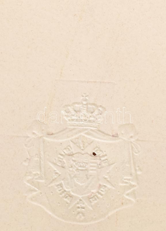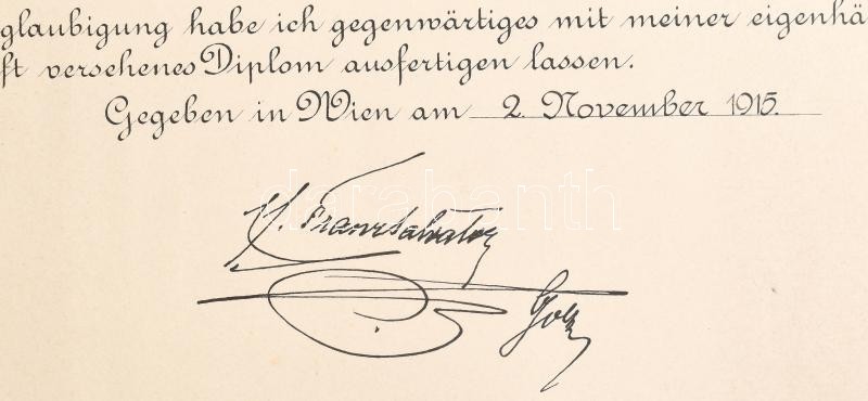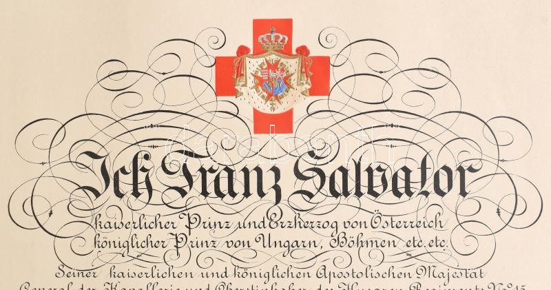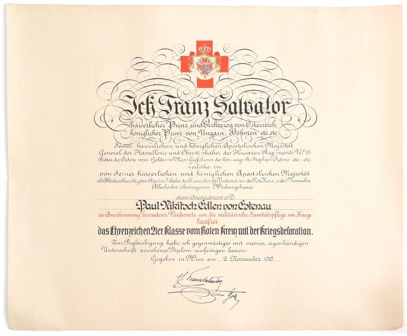 1916 Osztrák Vöröskereszt Díszjelvény II. osztályát, hadi ékítménnyel, adományozó oklevél, Paul Nikitsch Edlen von Esteau részére, Ferenc Salvator (1866-1939) főherceg aláírásával, német nyelven, szép állapotban./ 1916 Awarding diploma of Decoration for services to the red cross 2nd class with war decoration, for liutenant Paul Nikitsch Edlen von Esteau with signature of archduke Franz Salvator (1866-1939) in German language, damaged.