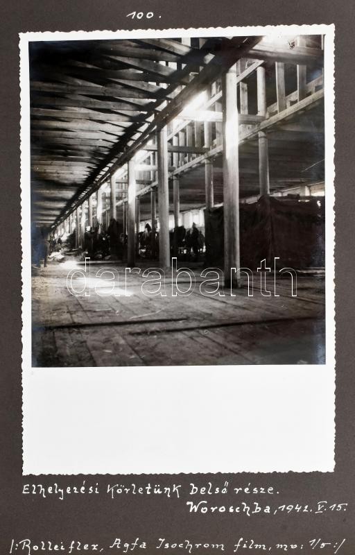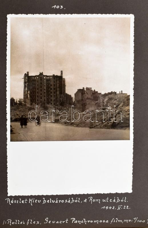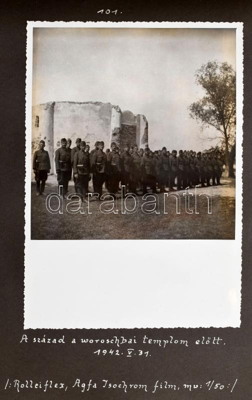 1942 Magyar katona művészi igényű fotóriportja az orosz frontra vonulás közben fényképezett képekkel. Indulás Felvidékről, lengyel és ukrán felvételek, közötte a szétlött Kijev, majd visszatérés Lillafüred környékére. Összesen 50 db nagy méretű, feliratozott fotó, a használt filmek és gépek feltüntetésével Albumban. Képek mérete: 13x18 cm / Hungarian soldier's picture report on the way to the Russian fields incl. Kiew. 50 photos