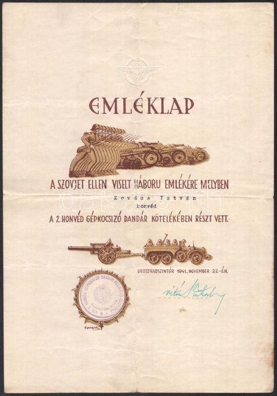 1945 Emléklap a szovjet ellen viselt háború emlékére, a M. kir. 2. Hon... https://www.darabanth.com/en/38-Major-auction/38.1/MIlitary/Military~15963/1945-Emleklap-a-szovjet-ellen-viselt-haboru-emlekere-a-M-kir-2-Honved-Gepkocsizo-Dandar~II2605190