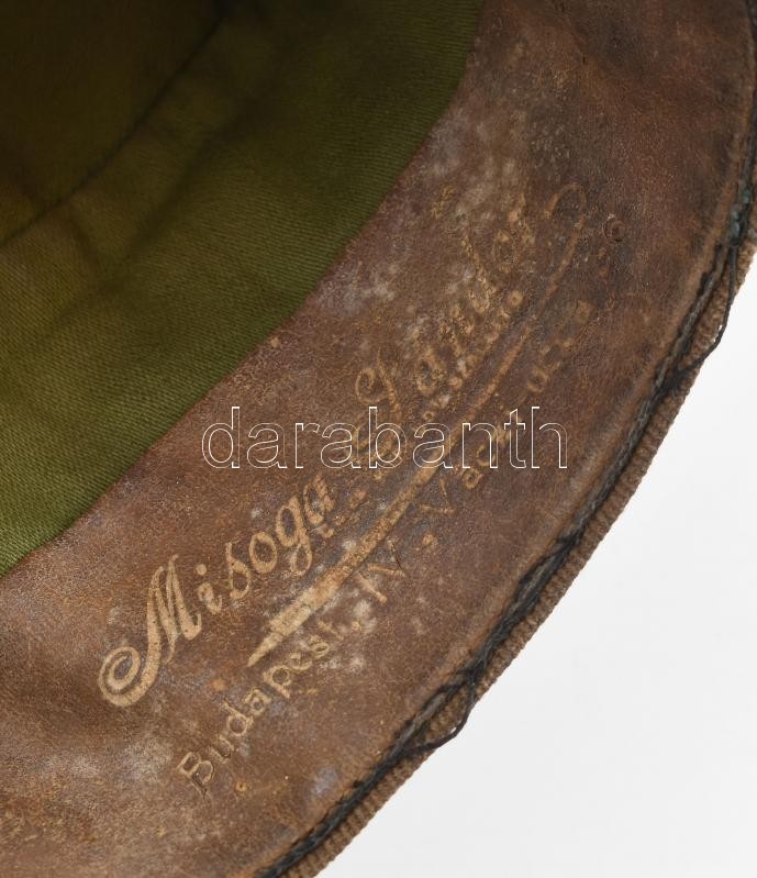 Description: M. kir. honv. tábori sapka, vezérőrnagyi rendfokozattal. fekete bársony cserfalombbal, olajággal díszített topánnal. Misoga János Budapest, jelzett, kevés sérüléssel. / Military cap for major general ranking officer. Small damage.