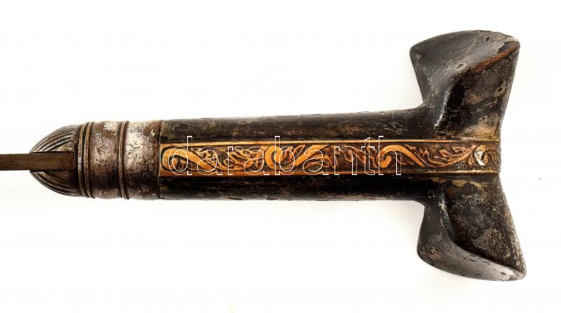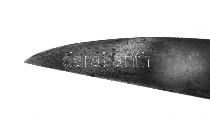 XIX. sz. Balkáni jatagán, réz-fa-fém markolattal, díszes pengével, kopott, jelzés nélkül, kopott, pengehossz: 45,5 cm, teljes hossz: 60 cm