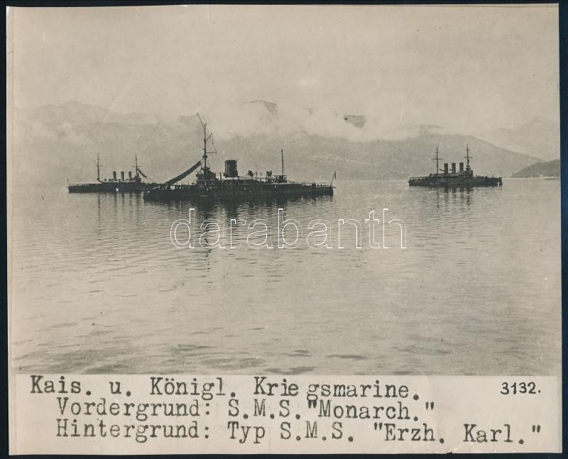 cca 1914-1918 Az Osztrák-Magyar Császári és Királyi Haditengerészet (K.u.K. Kriegsmarine) Monarch-osztályú partvédő páncélosai, az SMS Monarch (előtérben) és az SMS Budapest, illetve Erzherzog Karl-osztályú pre-dreadnought csatahajója (Schlachtschiff), az SMS Erzherzog Karl (háttérben) a Kotori-öbölben; feliratozott fotó, 20,5x16,5 cm / cca 1914-1918 The Austro-Hungarian Navy's (K.u.K. Kriegsmarine) Monarch-class coastal defense ships, SMS Monarch (foreground) and SMS Budapest, and Erzherzog Karl-class pre-dreadnought battleship (Schlachtschiff), SMS Erzherzog Karl (background) in the Bay of Kotor (Bocche di Cattaro), photo, 20.5x16.5 cm