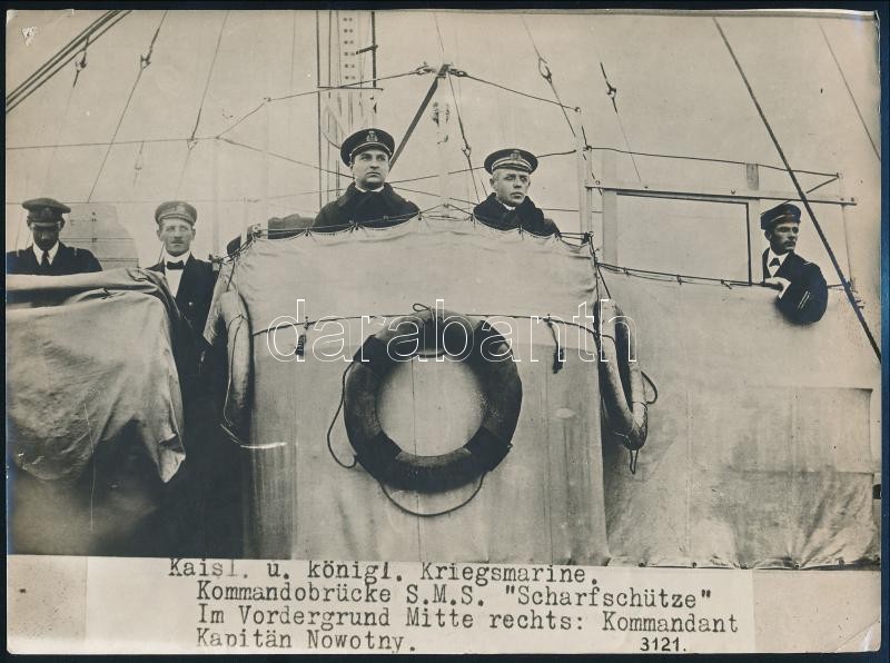 cca 1914-1918 Bogumil Nowotny (1872-1960) korvettkapitány, az Osztrák-Magyar Császári és Királyi Haditengerészet (K.u.K. Kriegsmarine) SMS Scharfschütze Huszár-osztályú rombolójának parancsnoka a hajó parancsnoki hídján, feliratozott fotó, sarkain kis sérülésekkel, 23x17 cm / cca 1914-1918 Bogumil Nowotny (1872-1960) corvette captain, commander of the SMS Scharfschütze Huszár-class destroyer (Zerstörer) of the Austro-Hungarian Navy (K.u.K. Kriegsmarine) on the ship's bridge, photo, slightly damaged on the corners, 23x17 cm