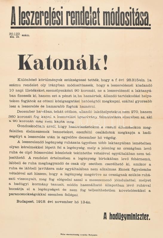 cca 1918 "A leszerelési rendelet módosítása. Katonák!", 1918... https://www.darabanth.com/en/38-Major-auction/38.1/MIlitary/Military~15963/cca-1918-A-leszerelesi-rendelet-modositasa-Katonak-1918-nov-13-a-hadugyminiszter-Lin~II2607988