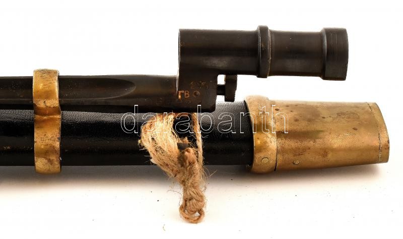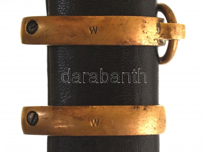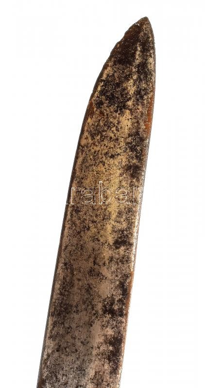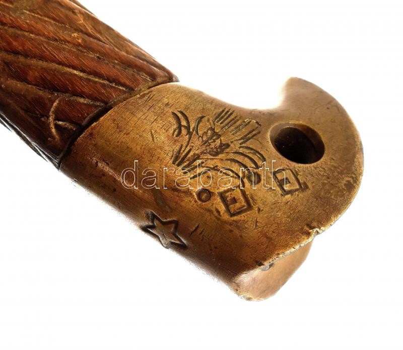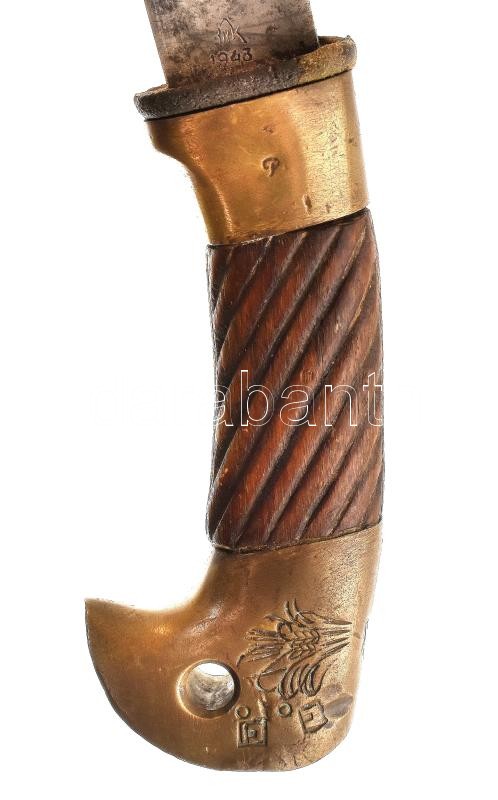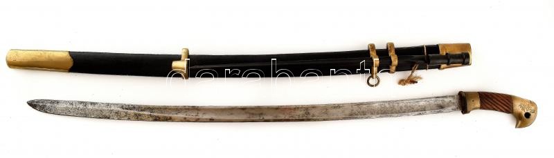 cca 1943 Szovjet kozák saska, M1927, fa-réz markolattal, a markolaton stilizált szovjet címerrel, bőr borítású, réz szerelékekkel ellátott tokkal, a tokon Mosin-Nagant bajonettel, jelzett, kopásnyomokkal, a kard hegyén kis sérüléssel, pengehossz: 79 cm, teljes kardhossz: 93,5 cm, tok hossz: 84 cm, bajonett hossz: 50 cm