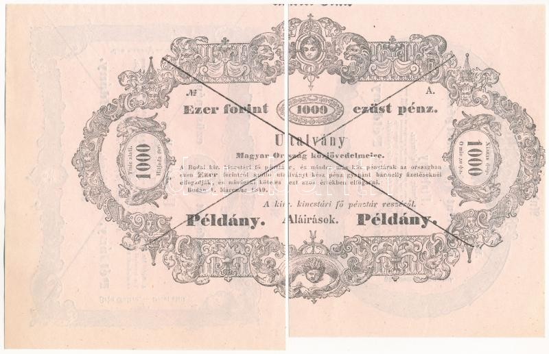 1849. 1Ft + 2Ft + 5Ft + 10Ft + 100Ft + 1000Ft "Almássy" formulare Ãvrészek 3 darabban (100Ft-os hátoldalán 1Ft és 2Ft részben + 1000Ft-os két részre vágva, hátoldalon teljes 5Ft és 10Ft) T:I,I-