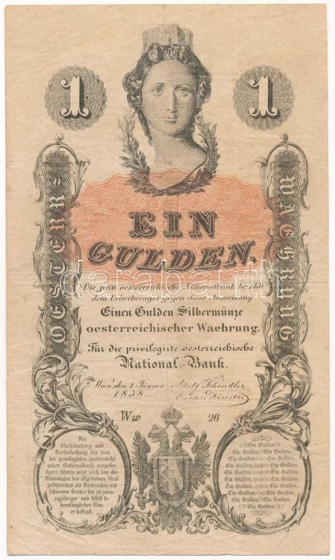 1858. 1G "Ww 26" vízjeles papíron T:III- / Austrian Empire 1858. 1 Gulden "Ww 26" on watermarked paper C:VG