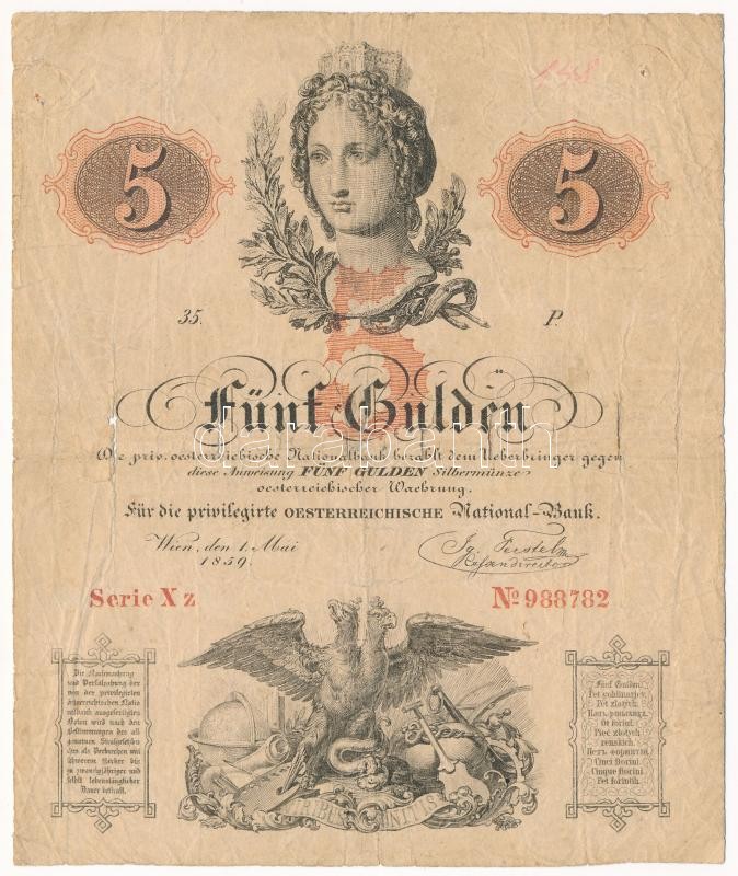 1859. 5G "Xz 988782" vízjeles papíron T:III- hajtás illetve ... https://www.darabanth.com/en/38-Major-auction/38.1/Numismatics/Hungarian-and-foreign-banknotes~15627/1859-5G-Xz-988782-vizjeles-papiron-TIII-hajtas-illetve-vizjel-menten-tobb-helyen-ly-Au~II2611522