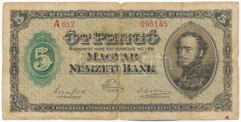 1926. 5P "A 012 095145" T:III- / Hungary 1926. 5 Pengő "A 012 095145" C:VG