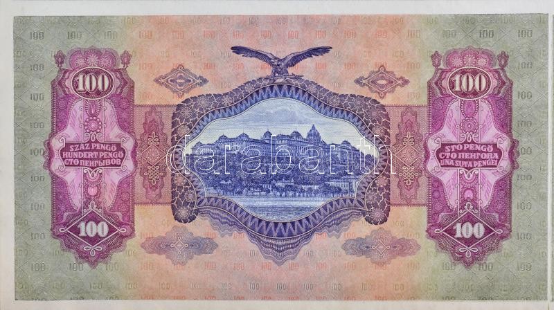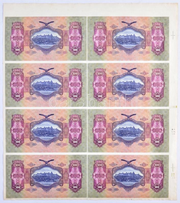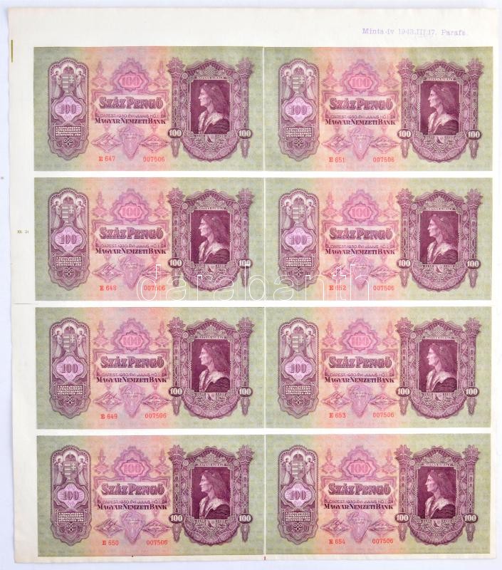 1930. 100P 8db-os vágatlan MINTA ÍV, "1943. III. 17." dátummal, "PARAFA" kísérleti nyomat jelzéssel , látható illesztőkerettel. A bankjegyek mind "007506" sorszámmal, de sorszámkövető sorozatszámokkal "E 647 - E 654" T:I- kissé hullámos papír R! Hungary 1930. 100 Pengő in a SPECIMEN SHEET of 8 with "1943. III. 17." date and "PARAFA (Corkwood)" experimental printing mark, with visible sheet edge frame. All banknotes with "007506" serial number, but with sequential series number "E 647 - E 654" C:AU slightly wavy paper RARE!