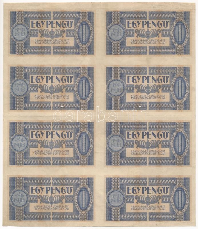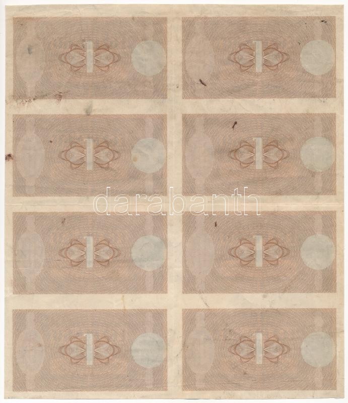 Description: 1938. 1P fázisnyomat 8db-os ívben, előlap csak alapnyomat T:III fo. / Hungary 1938. 1 Pengő phase print, 8pcs in one sheet, front is only base print C:F spotted Adamo SP1e