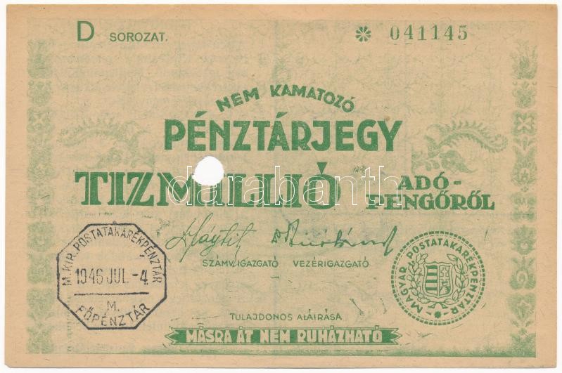 1946. 10.000.000AP nem kamatozó Pénztárjegy "Másra Át Nem Ruházható", előlapon "M. KIR. POSTATAKARÉKPÉNZTÁR - FŐPÉNZTÁR" hátlapon "SZÉKESFEHÉRVÁR" bélyegzéssel, lyukasztással érvénytelenítve T:I- / Hungary 1946. 10.000.000 Adópengő non-interest savings certificate "Másra át nem ruházható (Non-transferable)", with "M. KIR. POSTATAKARÉKPÉNZTÁR - FŐPÉNZTÁR" and "SZÉKESFEHÉRVÁR" cancellations, invalidet by hole C:AU