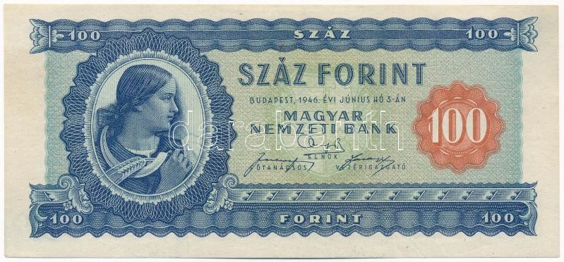 Description: 1946. 100Ft "B 069 093235" nyomdai papírráncokkal T:I-,II hajtatlan, de bal felső saroknál két törés nélküli hajlás / Hungary 1946. 100 Forint "B 069 093235" with printing creases C:AU,XF unfolded, but two faint bends at the upper left corner