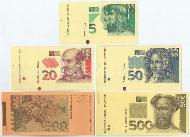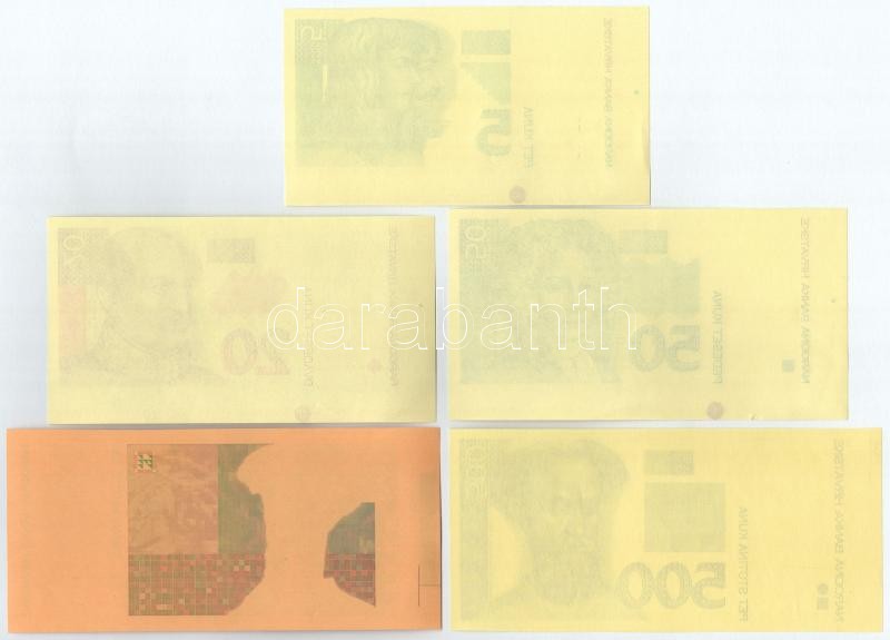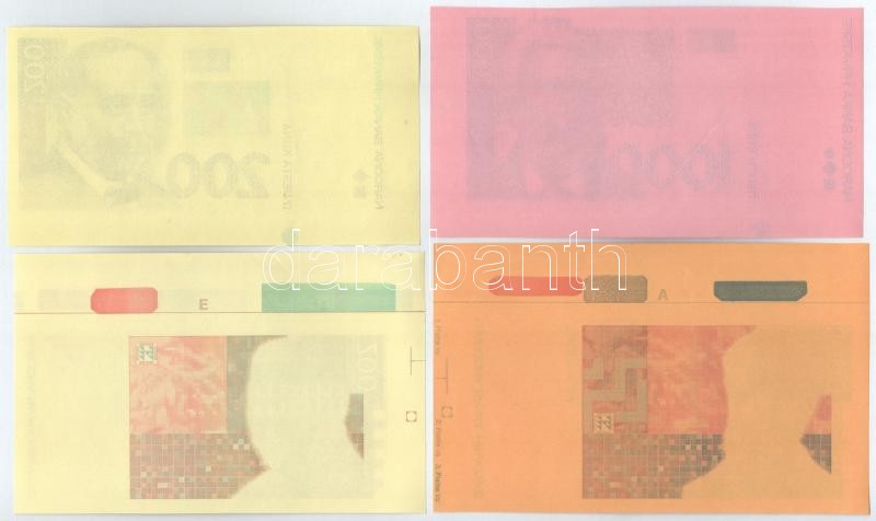 Horvátország 1993 (1994). 5K előlapi színpróba + 20K előlapi színpróba + 50K előlapi színpróba + 200K előlapi színpróba + 200K előlapi és hátlapi színpróba + 500K előlapi színpróba + 500K előlapi és hátlapi színpróba + 1000K előlapi színpróba + 1000K előlapi és hátlapi színpróba. Összesen 9 darab, mind ívszéli darab, hátlapi színpróbák látható illesztőkerettel T:I,I- kissé hullámos papír, az egyiken apró szakadás / Croatia 1993 (1994). 5 Kuna front color trial + 20 Kuna front color trial + 50 Kuna front color trial + 200 Kuna front color trial + 200 Kuna front and back color trial + 500 Kuna front color trial + 500 Kuna front and back color trial + 1000 Kuna front color trial + 1000 Kuna front and back color trial. Sum total of 9 pieces, all from sheet edge, the back color trials with edge markings C:UNC,AU slightly wavy paper, small tear on one