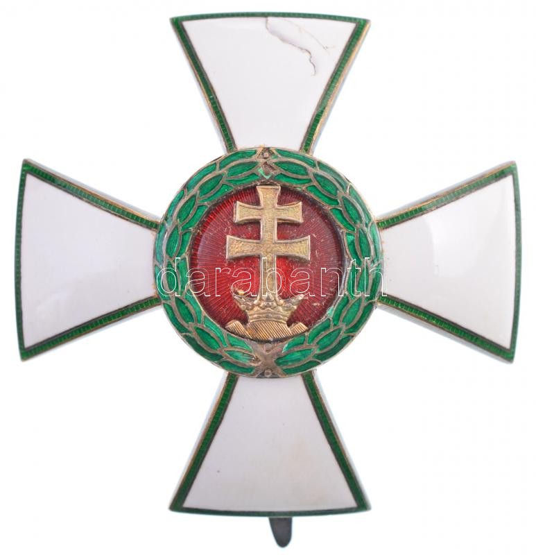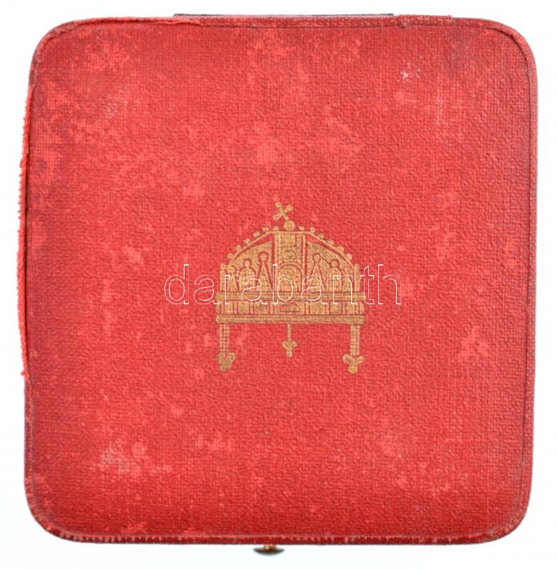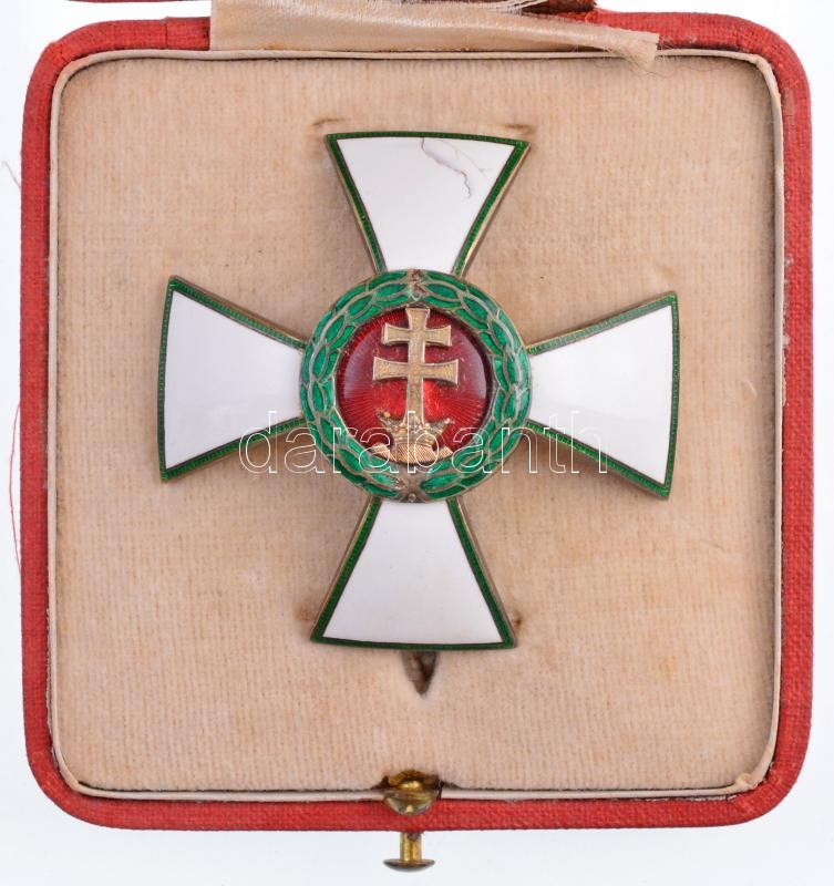 Description: 1935. "A Magyar Érdemrend Tisztikeresztje" jelzetlen zománcozott kitüntetés függőleges tűvel, eredeti kopottas tokban T:2 zománchiba / Hungary 1935. "Hungarian Order of Merit, Officer's Cross" enamelled decoration without hallmark, with vertical pin, in original, but worn case! C:XF enamel error