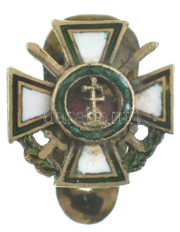 Description: 1939. A Magyar Érdemrend tisztikeresztje hadiékítménnyel és kardokkal kitüntetés miniatűrje, zománcozott gomblyukjelvény (13x13mm) T:1- / Hungary 1939. Buttonhole badge of the Hungarian Order of Merit, Officer's Cross with a war decoration and swords decoration, enamelled (13x13mm) C:AU