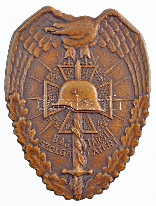 ~1930. "Országos Frontharcos Szövetség Bajtársi Szolgálatért" Br kitüntető jelvény, hátoldalán "BERÁN N BPEST DÖBRENTEI U. 2." gyártói jelzéssel (50x38mm) T:2 patina / National Front Fighter Association for Camaraderie Service" metal badge, with "BERÁN N BPEST DÖBRENTEI U. 2." makers mark on the back (50x38mm) C:XF patina