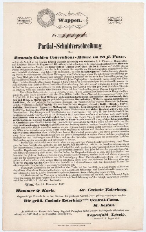 Ausztria / Bécs 1847. "Hammer és Karis" részkötvény gróf Esterházy Kázmér számára 20G értékben, szárazpecséttel T:II kis lyukak / Austria / Vienna 1847. "Hammer and Karis" partial debenture bond to Count Kasimir Esterházy about 20 Gulden, with embossed stamp C:XF small holes
