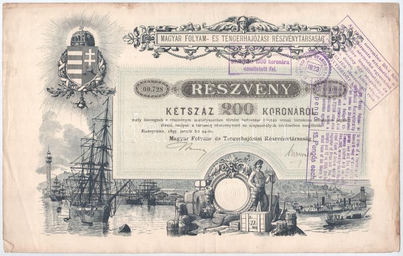 Budapest 1895. "Magyar Folyam- és Tengerhajózási Részvénytársaság... https://www.darabanth.com/en/38-Major-auction/38.1/Numismatics/Shares-tickets-emergency-coins-and-notes~15952/Budapest-1895-Magyar-Folyam-es-Tengerhajozasi-Reszvenytarsasag-reszvenye-200K-rol-vi~II2598916