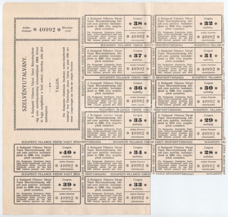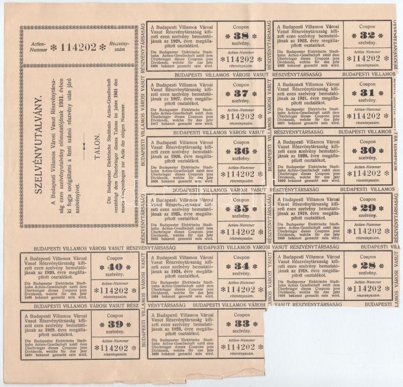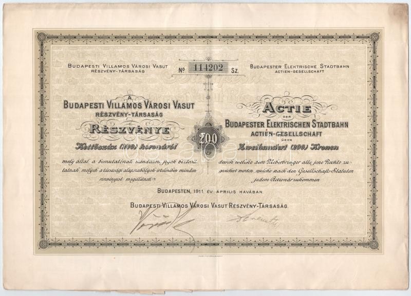 Budapest 1911. "Budapesti Villamos Városi Vasut Részvény-Társaság... https://www.darabanth.com/en/38-Major-auction/38.1/Numismatics/Shares-tickets-emergency-coins-and-notes~15952/Budapest-1911-Budapesti-Villamos-Varosi-Vasut-Reszveny-Tarsasag-reszvenye-200K-rol-szelv~II2612263