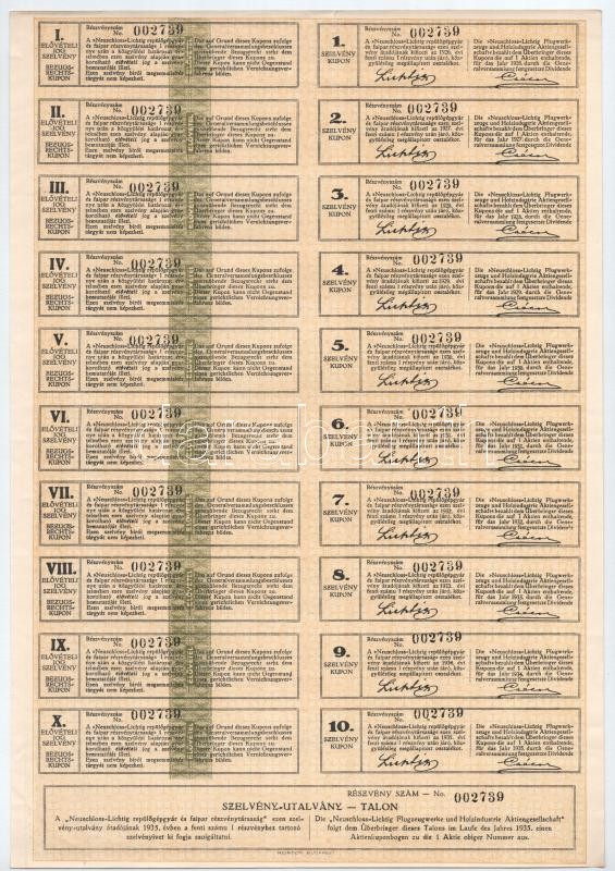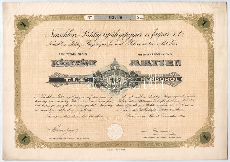 Budapest 1926. "Neuschlosz-Lichtig Repülőgépgyár és Faipari Részvénytársaság" részvénye 10P-ről szelvényekkel, szárazpecséttel T:II kis szakadások / Hungary / Budapest 1926. "Neuschlosz-Lichtig Repülőgépgyár és Faipari R.T. (Neuschlosz-Lichtig Airplane and Wood Company Corporation)" share about 10 Pengő, with coupons, embossed stamp C:XF small tears
