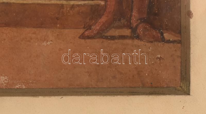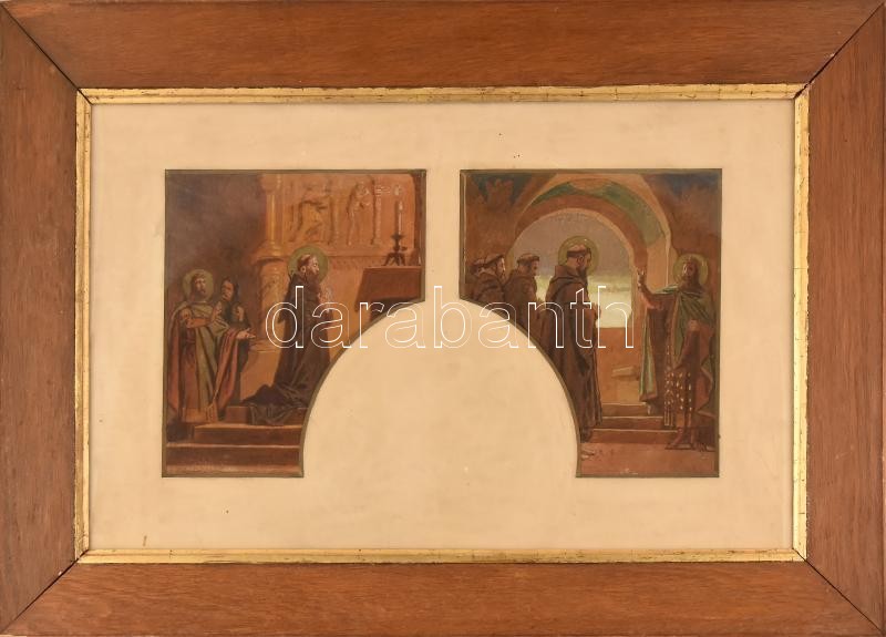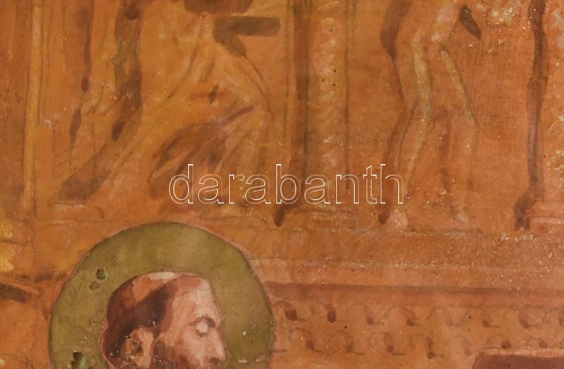 Székely Bertalan (1835-1910): A Pécsi Székesegyház Szent Mór kápolna részletének freskóterve, 1887-89 körül. Akvarell, papír. Jelzés nélkül, hátoldalán feliratozott és régi raglappal. Kb. 33×62 cm. Kisebb sérülésekkel. Üvegezett fakeretben. A pécsi székesegyház XIX. századi második átépítésekor több művész kapott megbízást a templom kifestésére. 1887 és 1889 között Székely Bertalan és Lotz Károly készítették el a kápolnák és az altemplom falképeit. Székely Bertalan a magyar történelem nagy eseményeit jelenítette meg a Mária- és a Szent-Mór kápolnákban. Kultúrtörténeti ritkaság!